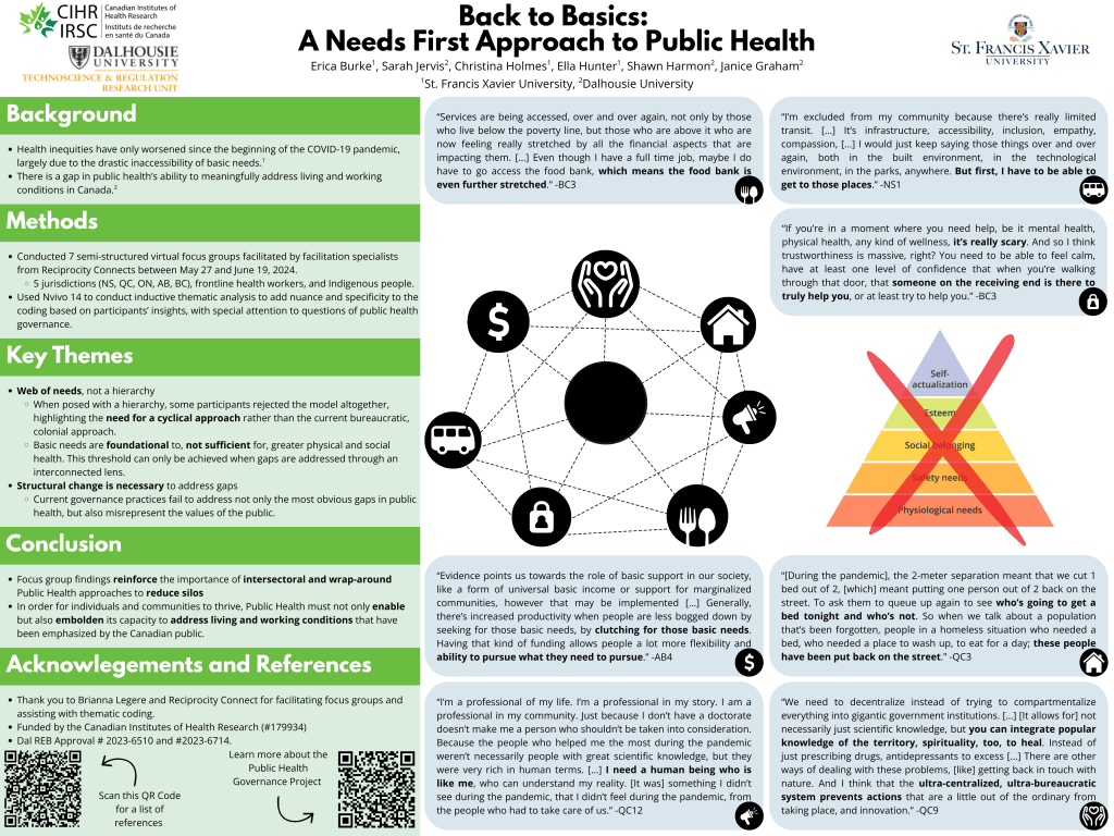 In preparation for the Technoscience and Regulation Research Unit (TRRU) Public Health Governance’s focus groups, we have been working on background information about the Canadian public’s perceptions of public health within the CIHR funded co-investigator’s team by exploring the use of secondary analysis of qualitative research, as well as a more conventional literature review. We presented our work at the CPHA 2024 in Halifax, April 23-25, 2024. This meant too many references for the poster! – They and the poster are below:
